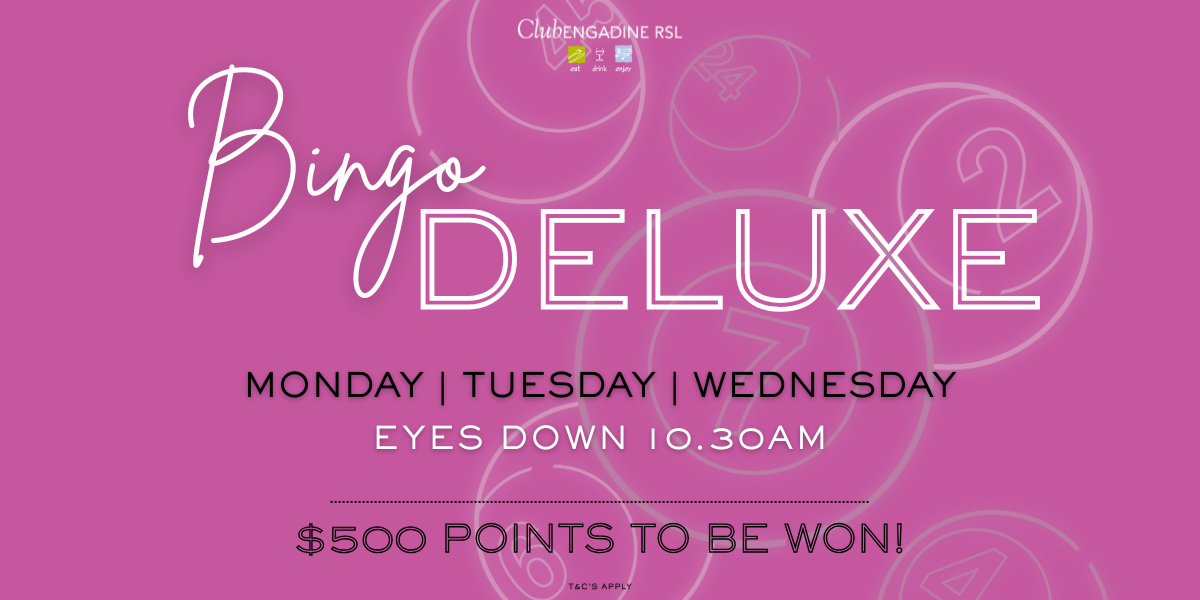 Every Thursday in the Everest Room Books on sale 6pm Eyes down 7pm 15 Games Bingo (Bingo Deluxe Jackpot Games included) 10 Cash Games Bingo Prizes: Bonus Points Cash Prizes: Determined by ticket sales $11.00 to play Bingo Deluxe Jackpot Games included in book price *Bingo participants must be a member of Club Engadine or... Read more »
